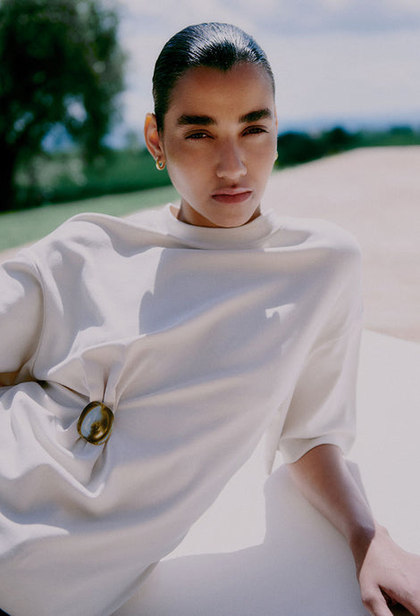The artists’ monumental work is also reflected in the spaciousness of the clothing – with voluminous cuts and wide trousers creating effortless silhouettes alongside oversized collars, buttons and turn-ups. Wrapping and structure are also key themes, with drawstrings, tie fastenings and belts added to bring definition to the wide or floaty silhouettes. Ribbed and pleated fabric add a structural element to many tops and dresses, supplemented by draping, gathers and overlapping details.